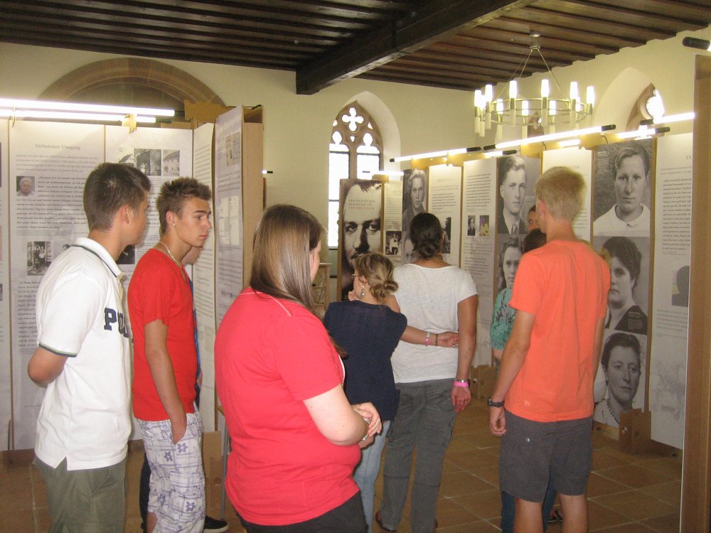Zu dem Thema „Sulzbach-Rosenberg unterm Hakenkreuz – NS-Zwangsarbeit im ländlichen Raum“ besuchte die 9. Klasse am Freitag, den 22.6.12 die Ausstellung im großen Rathaussaal in Sulzbach-Rosenberg. Dabei erfuhren sie von der Ausstellungsleiterin, von einem Zeitzeugen, in Videofilmen und in zahlreichen beschrifteten Bilderwänden, dass die Nationalsozialisten auch bei uns überall präsent waren. In der Stadt, in Gaststätten, auf Bauernhöfen und in der Maxhütte wurden überall Zwangsarbeiter in unserer Gegend eingesetzt.