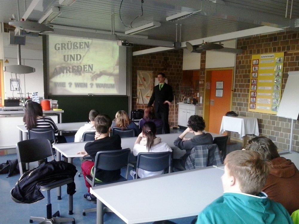 Es wurden die Themen Begrüßung, Essen und Trinken, Gähnen und Niesen, Umgang mit anderen, Kleidung, Verhalten in geschlossenen Räumen und in der Öffentlichkeit zum Teil sehr anschaulich behandelt. Im Hinblick auf die Berufsvorbereitung konnten die Schüler wertvolle Ratschläge mit auf den Weg nehmen. Nach dem Kurs gab es ein Zertifikat über die erfolgreiche Teilnahme.