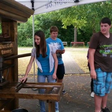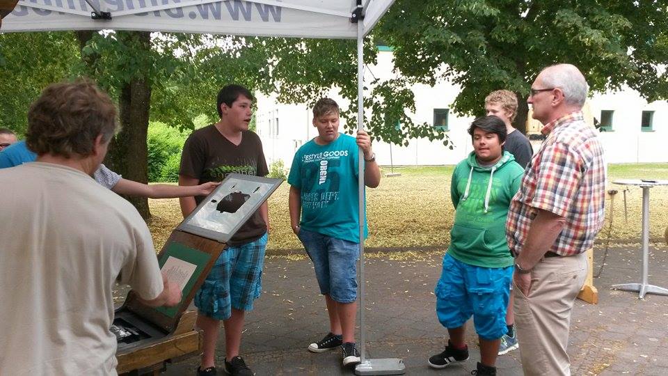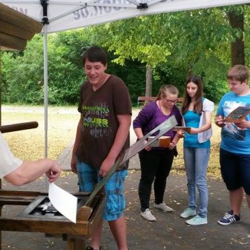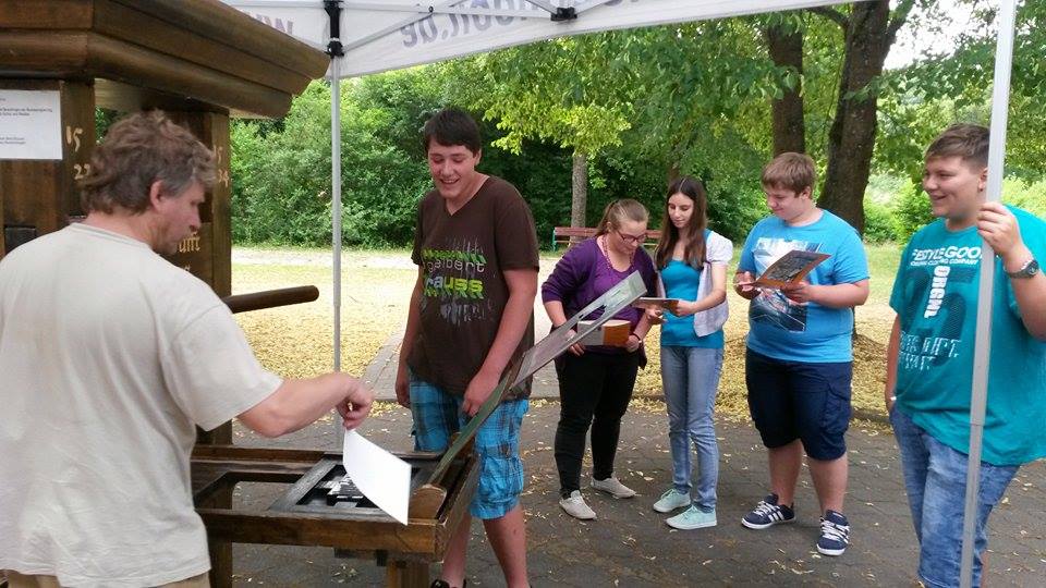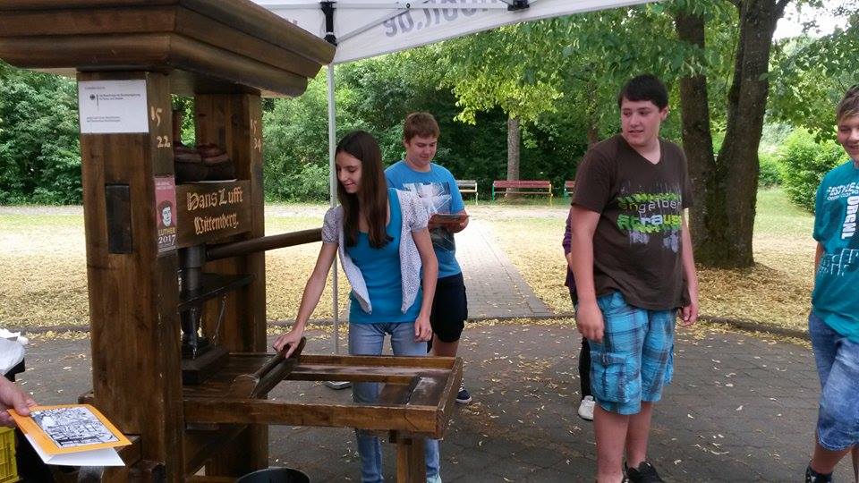Höhepunkt des Besuchs am Bibelmobil war die Druckerpresse, an der die Schüler ausprobieren konnten, wie Gutenberg im 15. Jahrhundert seine Bibeln gedruckt hat. Jeder Schüler konnte hier für sich selbst den Psalm 23 drucken.
