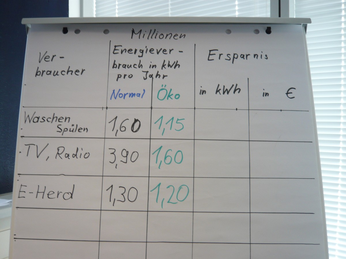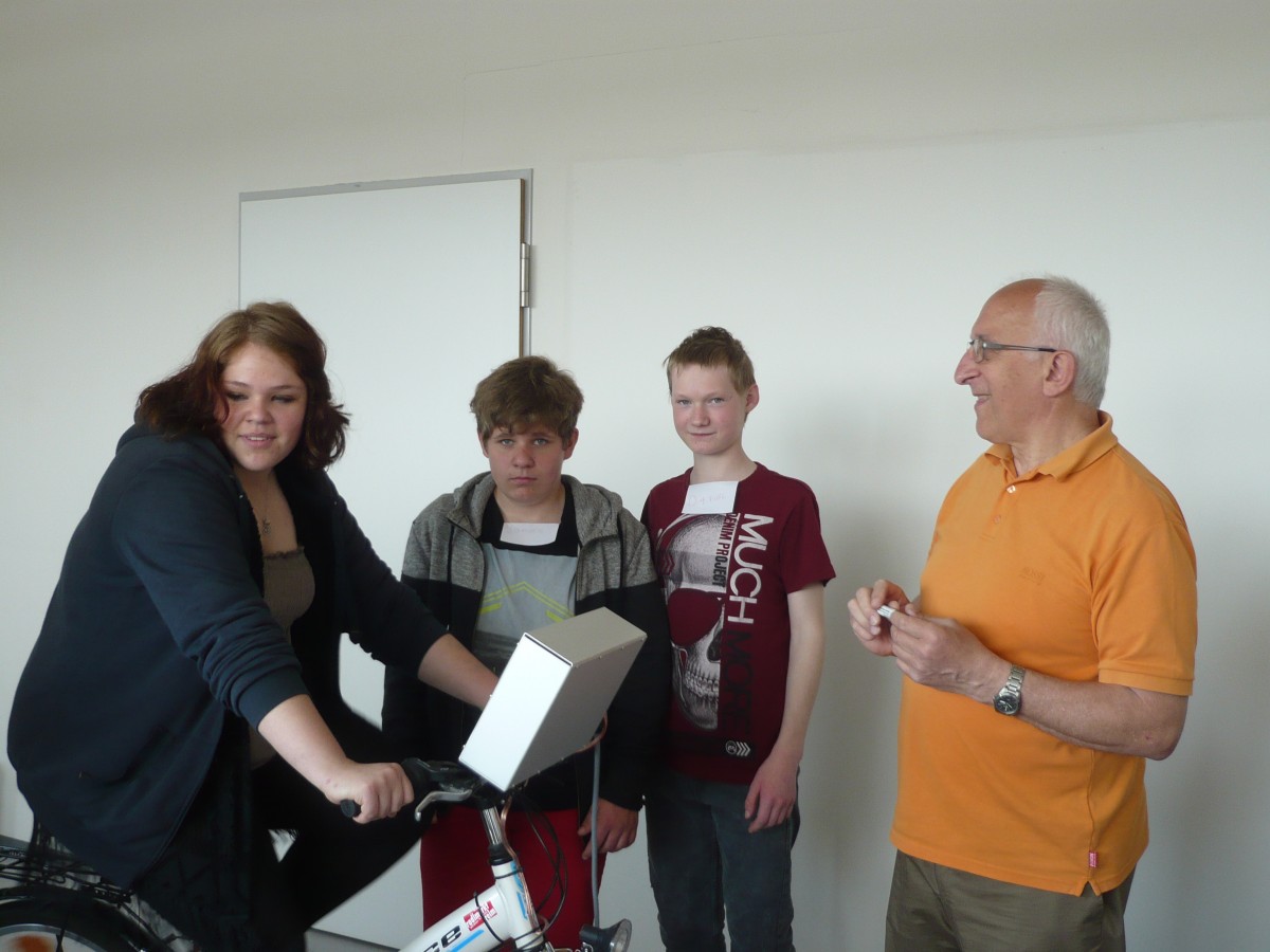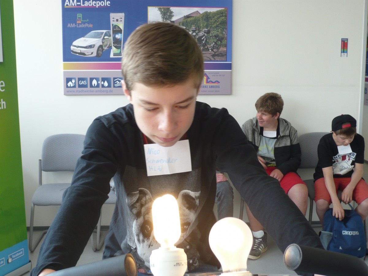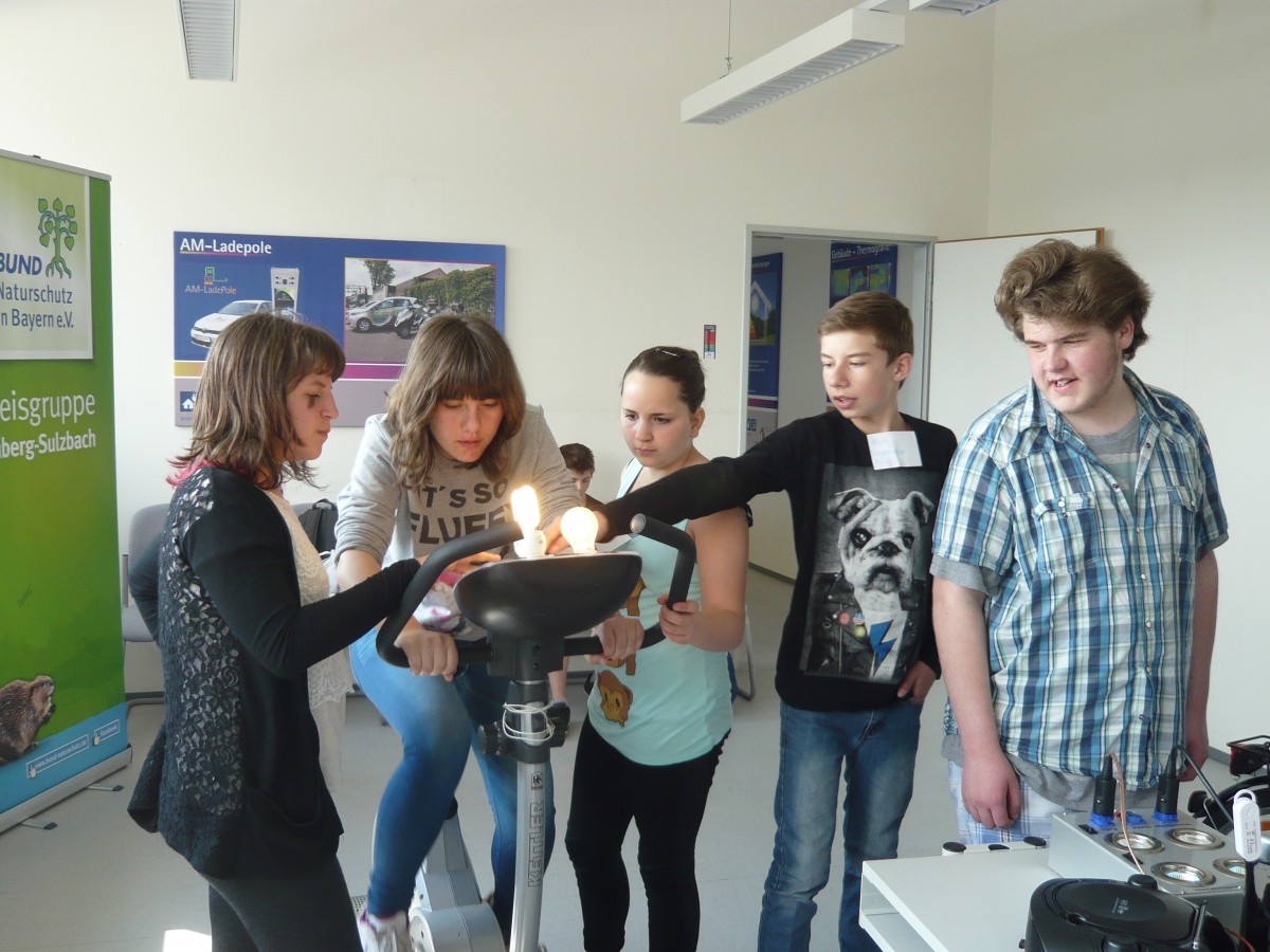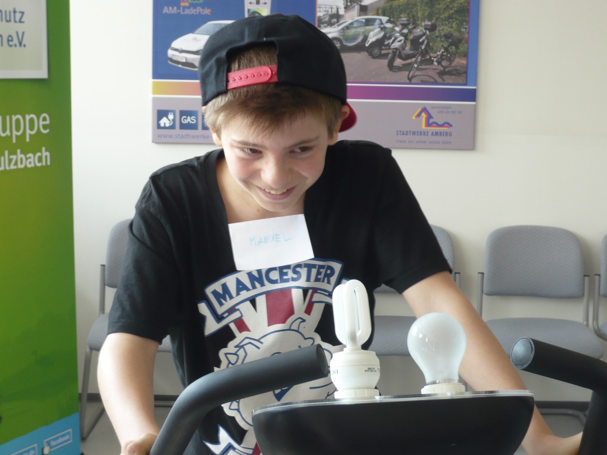 Die Auswirkungen unterschiedlicher Stromerzeuger und Stromverbraucher wurde den Schülern auf einer Leinwand sichtbar gemacht. Am Energiefahrrad konnten die Teilnehmer durch ihre Muskelkraft verschiedenen Energieverbraucher (Radio, Wasserkocher, Glühlampen, LED-Lampen) mit Strom versorgen. So war der Energieaufwand bei LED-Lampen viel geringer als bei Glühlampen. Durch vereinte Kräfte schaffte man es sogar, eine Tasse Wasser von 20 Grad Celsius auf 50 Grad zu erhitzen. Die momentan erbrachte Leistung entsprach der Leistung des Verbrauchers und wird mit der Einheit Watt (W) angegeben. Es wurde eine elektrische Leistung von bis zu 200 W erreicht. Bei den erneuerbaren Energien kamen Biogasanlagen, Windenergieanlagen und Photovoltaikanlagen zum Einsatz. Die Sonnenenergie wurde durch elektrische Strahler simuliert. Den Schülern wurde bewusst, dass das Handeln eines Einzelnen nur geringe Auswirkung hat, während ein gemeinsames Handeln aller Beteiligten sich positiv auf die Ökobilanz eines Dorfes auswirkt. Mit einem Messgerät konnte der Energieverbrauch von elektrischen Geräten im Standby gemessen werden. 100 Millionen Geräte im Standby erfordern den Strom eines ganzen Atomkraftwerkes. Auch das Thema Energiesparen wurde angesprochen. Interessierte Schulklassen können sich mit Peter Zahn vom Bund Naturschutz in Verbindung setzen Tel. 09661/9740.