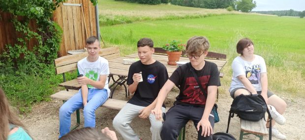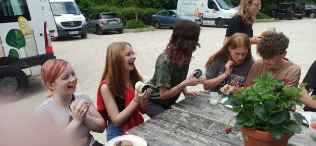 Am Rückweg bekamen die Zwergziegen sowie Ponys noch eine Streicheleinheit, bevor wir uns mit hauseigenem Apfelsaft stärken konnten. Zum Ende durfte jeder Schüler selbst Butter herstellen, indem er ein vorbereitetes Glas Molke so lange schüttelte bis ein „Klumpen Butter“ entstand. Selbständig produziert und an der frischen Luft schmeckt ein Butterbrot mit Schnittlauch oder Tomaten einfach doppelt gut!!