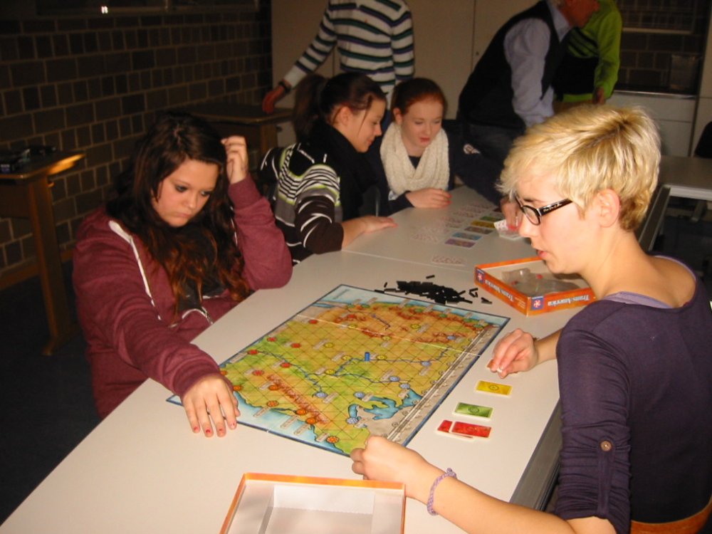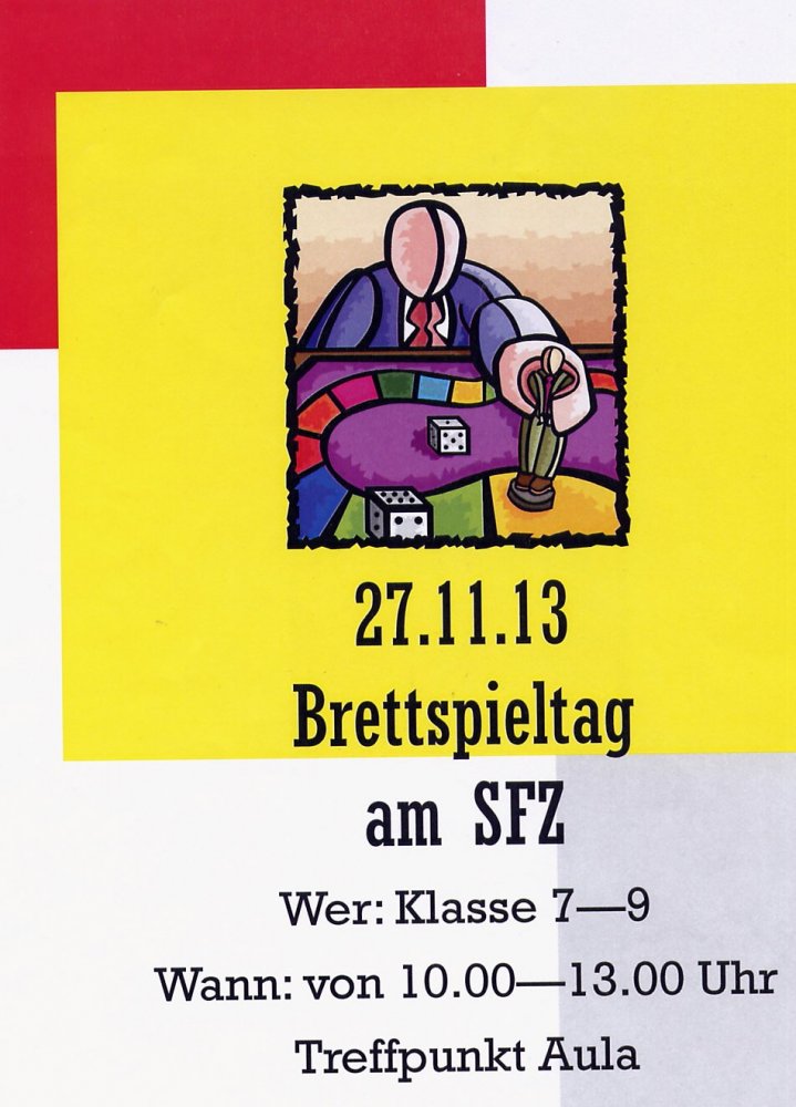 6 Dez. 2013BrettspieltageAm 27.11.13 fand vormittags von 10 bis 13 Uhr der Brettspieltag am SFZ statt. Veranstaltet vom Kreisjugendring konnten die 4 Klassen 7-9 aus 50 unterschiedlichen Brettspielen auswählen und nach Herzenslust miteinander spielen.