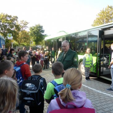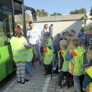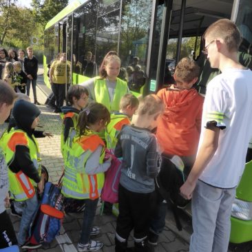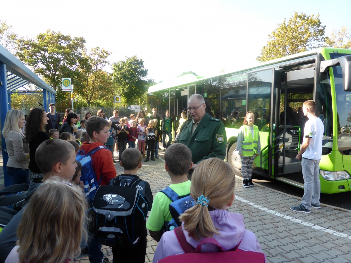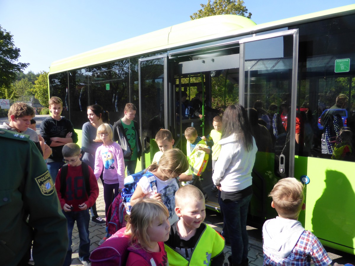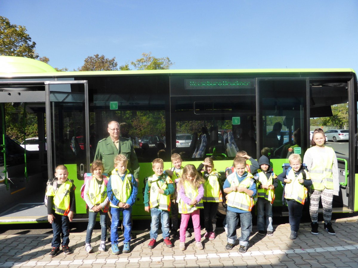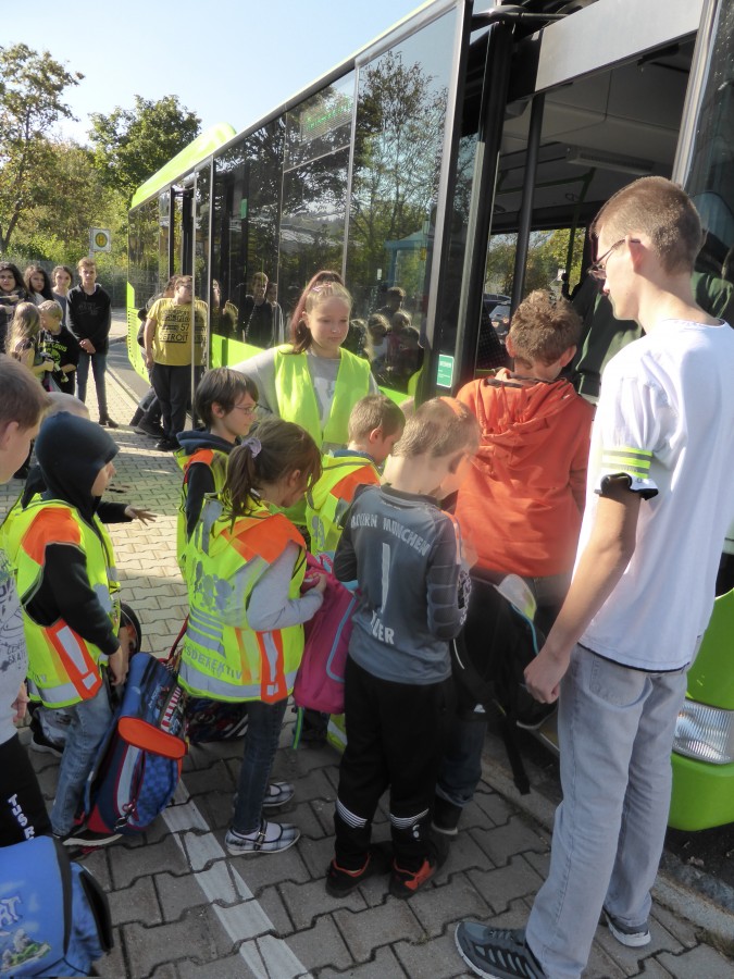 Beim Aussteigen schärfte Herr Aulinger den Kindern noch einmal ein, wie wichtig es ist, sich auch dann genau umzuschauen. Es könnte ja gerade in dem Moment vielleicht ein Radfahrer direkt am Bus vorbeifahren und das wäre sehr gefährlich!
