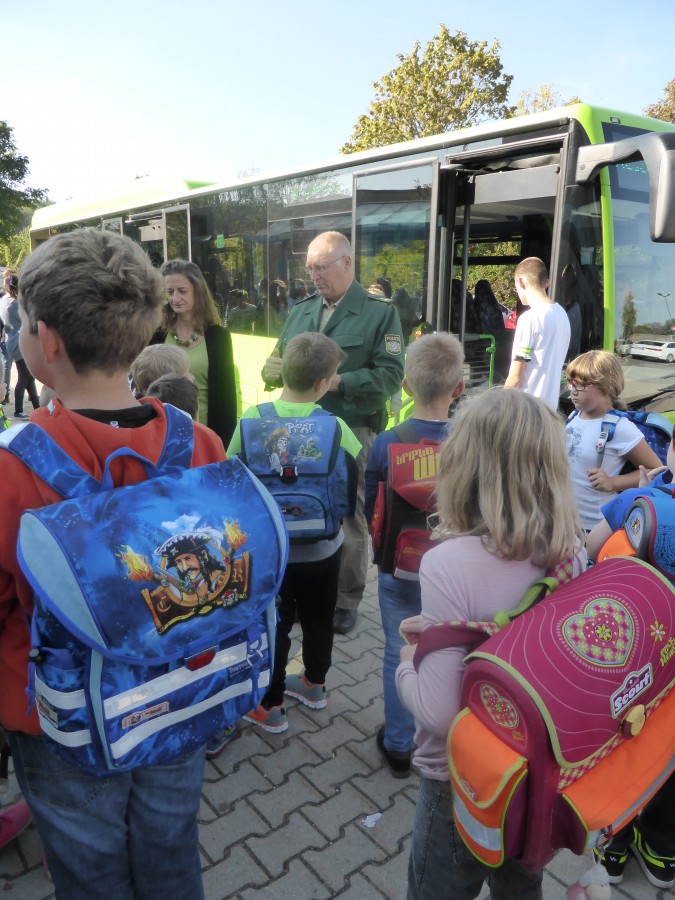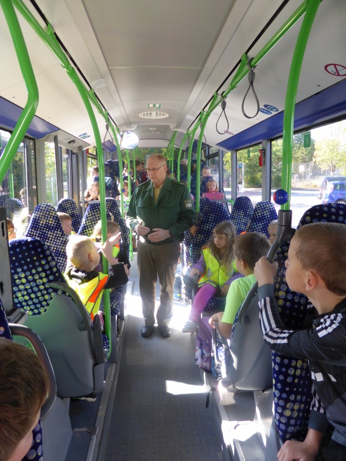 Dabei hörten die Kinder den Ausführungen des Verkehrserziehers nicht nur interessiert zu, das richtige Verhalten im Bus konnte in der Praxis gleich ausprobiert werden. Der Busfahrer drehte mit den Kindern, den Lehrkräften und dem Polizisten eine kleine Runde im Krötenseegebiet.