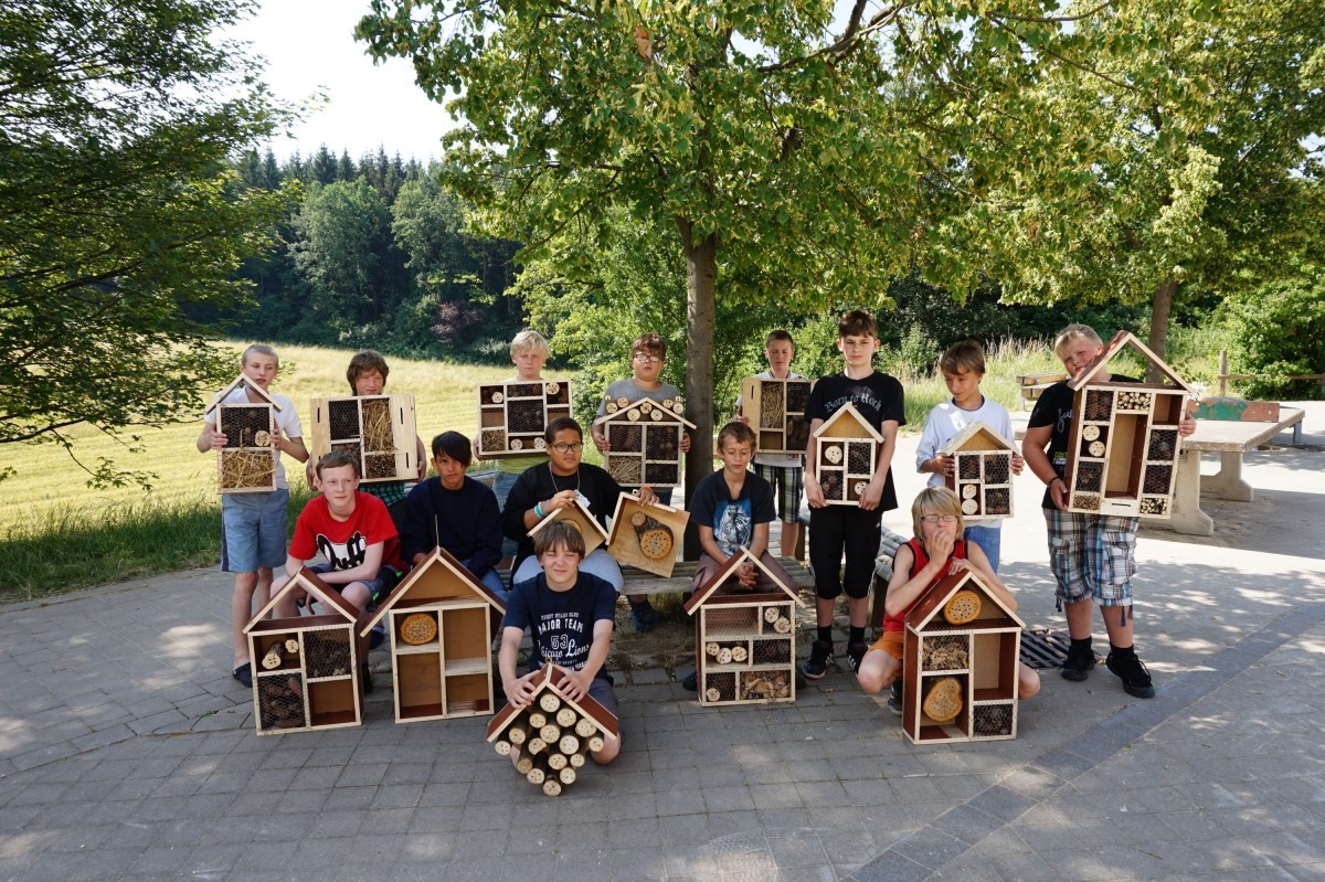 Angeregt vom Neubau des Schulhauses betätigten sich die Schüler der Klassen HL 6 und T 5/6 ebenfalls baulich. Gerodete Beete und gefällte Bäume – die Baustelle hinterlässt Spuren. Die Schüler wollten der Natur etwas Gutes tun. Sie bauten im Werkunterricht Insektenhotels für alles was so „kreucht und fleucht“. Von der Planzeichnung bis zum fertigen Werkstück dauerte es einige Wochen. Fachlich unterstützt wurden die Schüler dabei durch den Schreiner Karl Lehnerer. Nun sind die Hotels bezugsfertig: zahlreiche Wildbienen, Hummeln, Fliegen und Käfer können sich hier ansiedeln und überwintern.