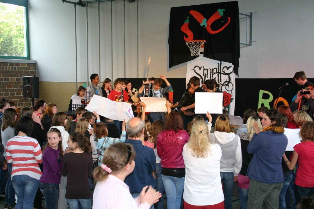In einem abwechslungsreich gestalteten Programm konnten die Schülerinnen und Schüler mit sonderpädagogischem Förderbedarf aus den drei Schulen einmal wirklich zeigen, dass ungemein viel Talent in ihnen steckt. Ob es die musikalische Performance auf der Rockbühne oder die bis ins Detail durchgeplanten Choreographien der Tanzgruppen war, zum Publikum sprang sofort der Funke über und die gut zweistündige Veranstaltung bereitete allen Beteiligten eine große Freude. Als Höhepunkt des „Chili-Rock-Festivals“ intonierten die drei Schülerbands zusammen den Klassiker „Knockin‘ on heaven’s door“. Zu guter Letzt dankte Schulleiter Axel Malich dem Initiator des Festivals, Studienrat Uli Radl, sowie allen beteiligten Helfern und Helferinnen für eine gelungene Veranstaltung, die unbedingt nach einer Wiederholung verlangt.