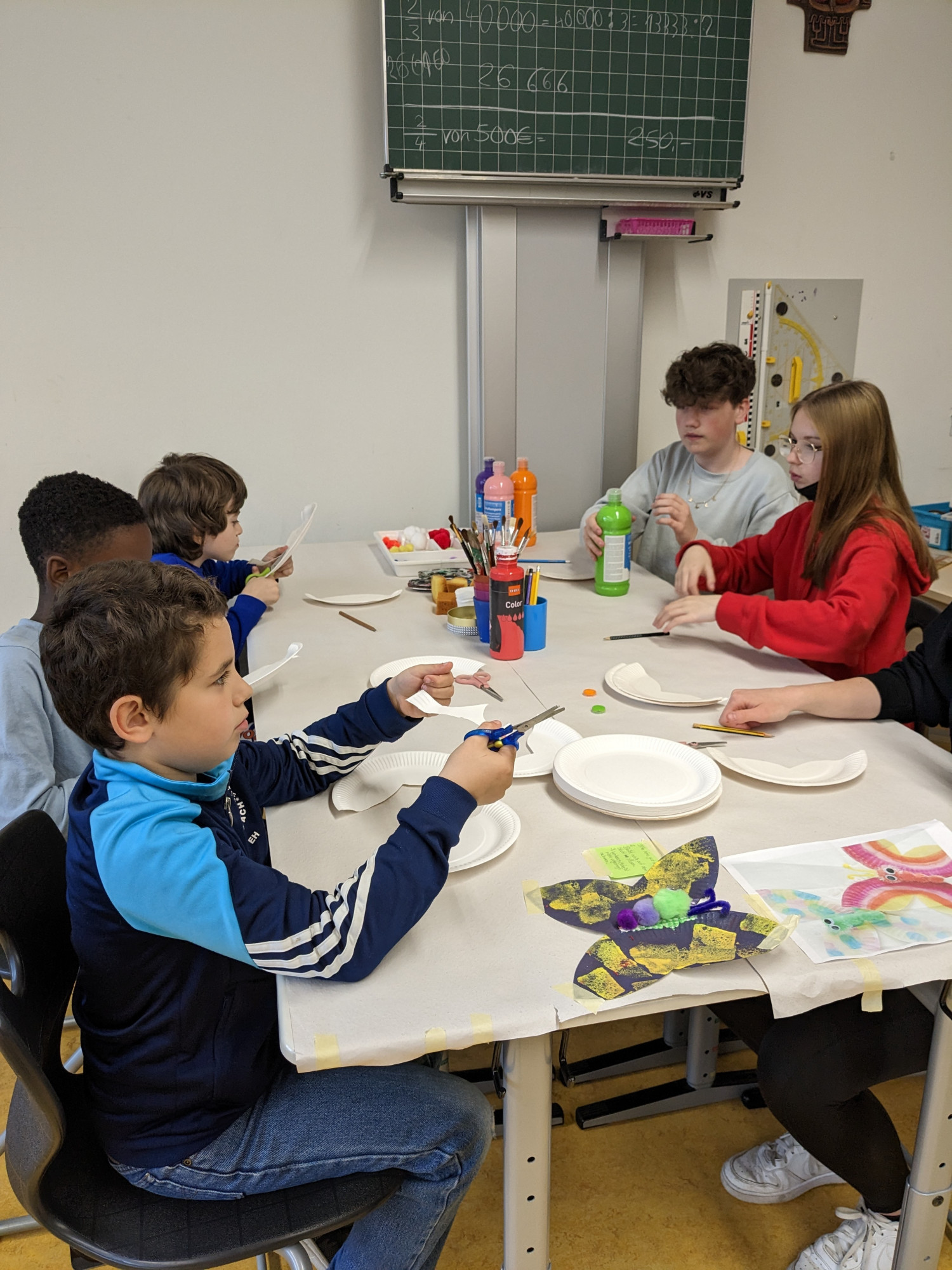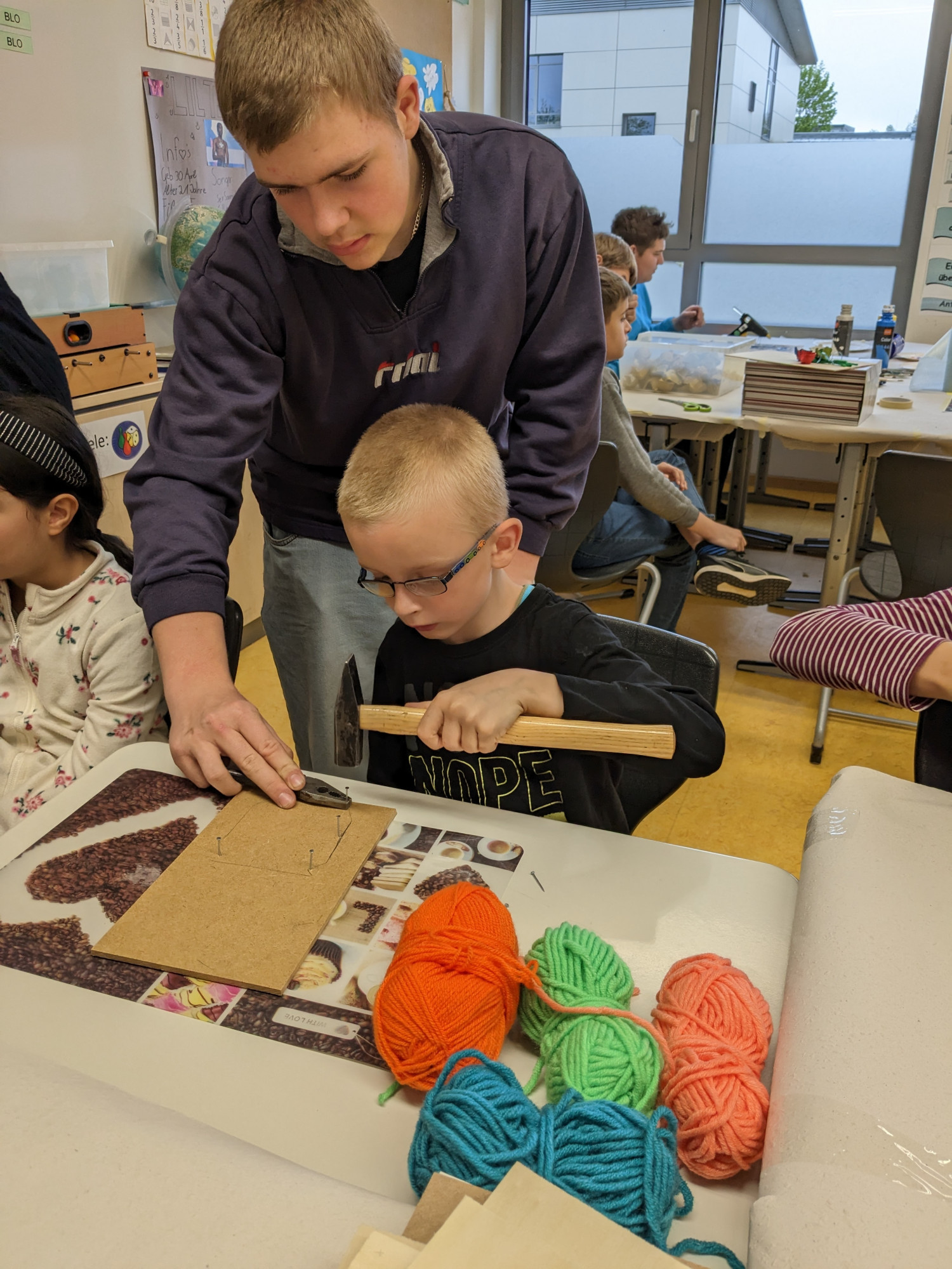 Heute planten und veranstalteten die Großen von Frau Schindler eine Bastelaktion mit den Kleinen von Herrn Lunz. Dafür überlegt sich die 7/8 im Vorfeld vier geeignete Bastelangebote. Sie planten deren Durchführung, besorgten die Materialien und Werkzeuge, bauten die Stationen auf und überlegten sich zudem Regeln und Hinweise für die jüngeren SchülerInnen.