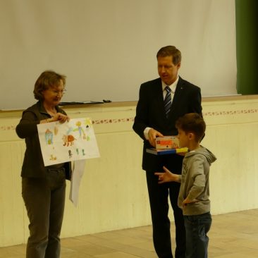 Nun folgte die mit Spannung erwartete Preisverleihung. Aufgabe für die Schülerinnen und Schüler war es, ein Bild zum Thema „Zeig uns, wer dein Held ist“ zu gestalten. Die Jury hatte es nicht leicht, aus den gelungenen Einreichungen die besten zu benennen. Lehrerin Sibylle Gnahn präsentierte dem versammelten Publikum die prämierten Werke. Als persönliche Vorbilder waren neben bekannten Persönlichkeiten auch fiktive Heldenfiguren aus Märchen, Sagen und Comics zu sehen. Die Gewinner nahmen unter großem Applaus ihre verdienten Preise entgegen. Zu gewinnen gab es in diesem Jahr Bastelboxen „Farbenschleuder“, Malsets, Selbstaufblasbare Matratzen und Kinogutscheine.