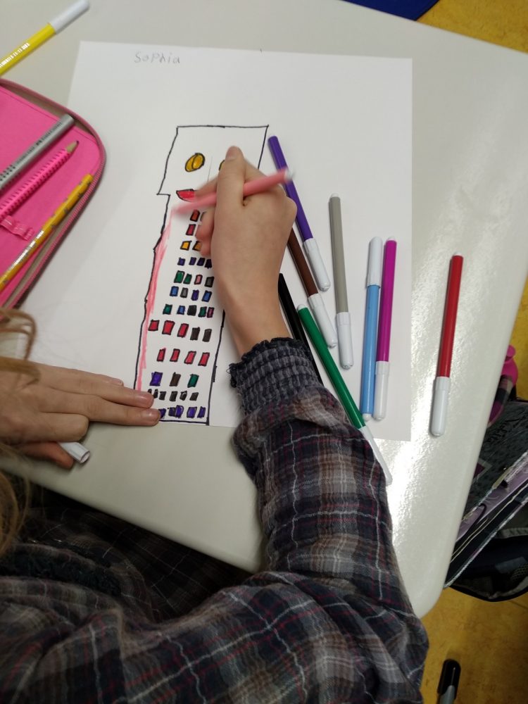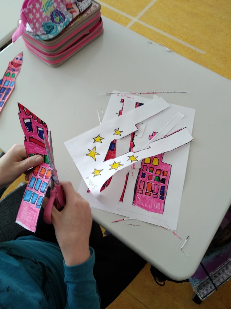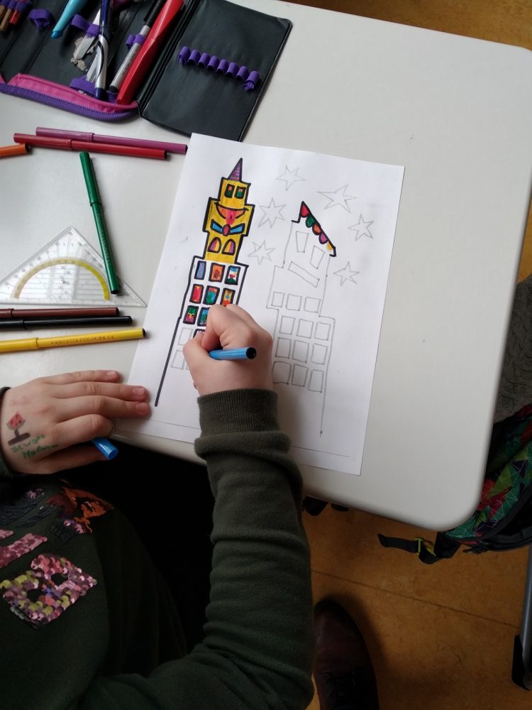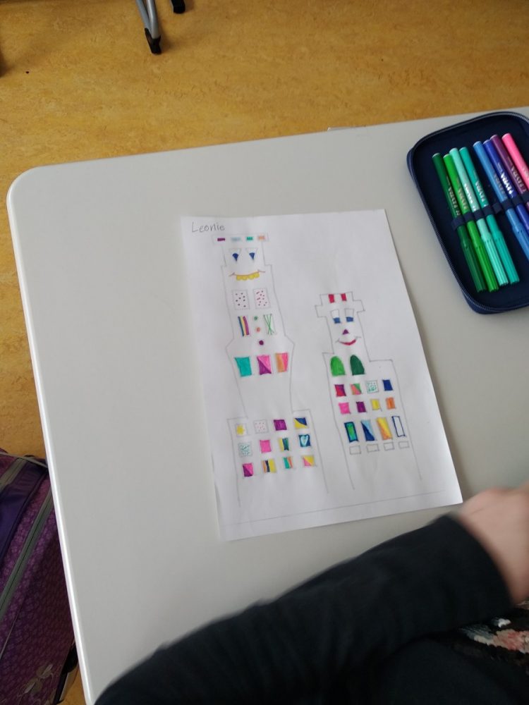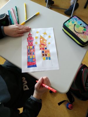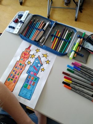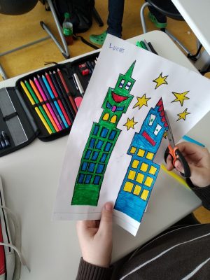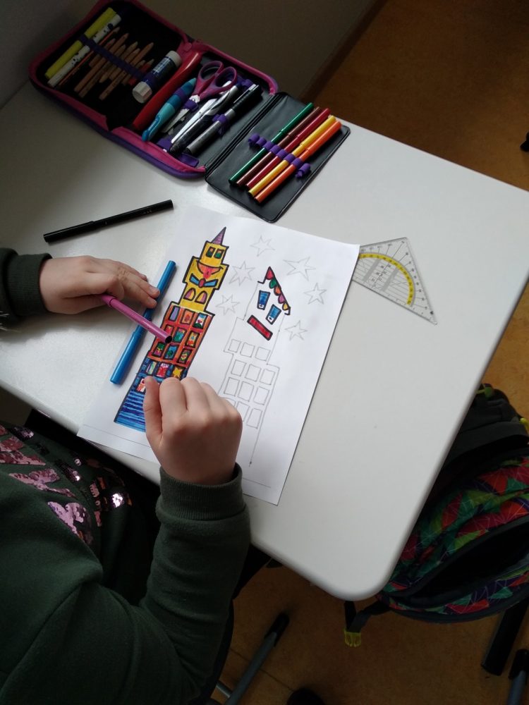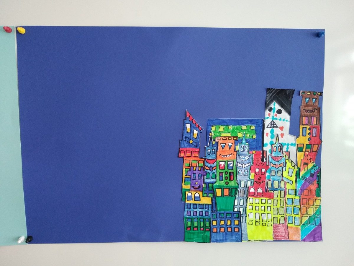 Einige Wochen haben wir in der Klasse 4/5 an einem Gemeinschaftsbild frei nach James Rizzi gearbeitet. Dabei haben wir zunächst alle Vorlagen nach unseren Farbvorstellungen ausgemalt. Anschließend durften wir unsere eigenen Häuser entwerfen und farblich gestalten. Die Häuser haben wir nach und nach aufgeklebt. Zum Schluß haben wir unser Gemeinschaftsbild noch mit selbst entworfenen Fahrzeugen, Flugzeugen, Ufos, Sternen und Wolken verziert.