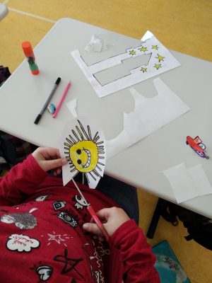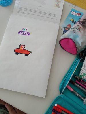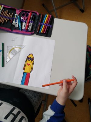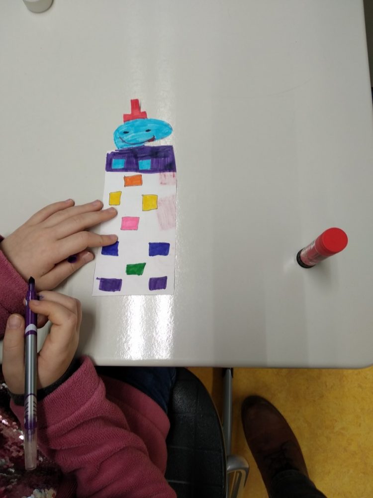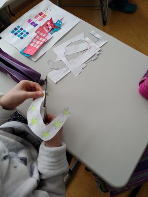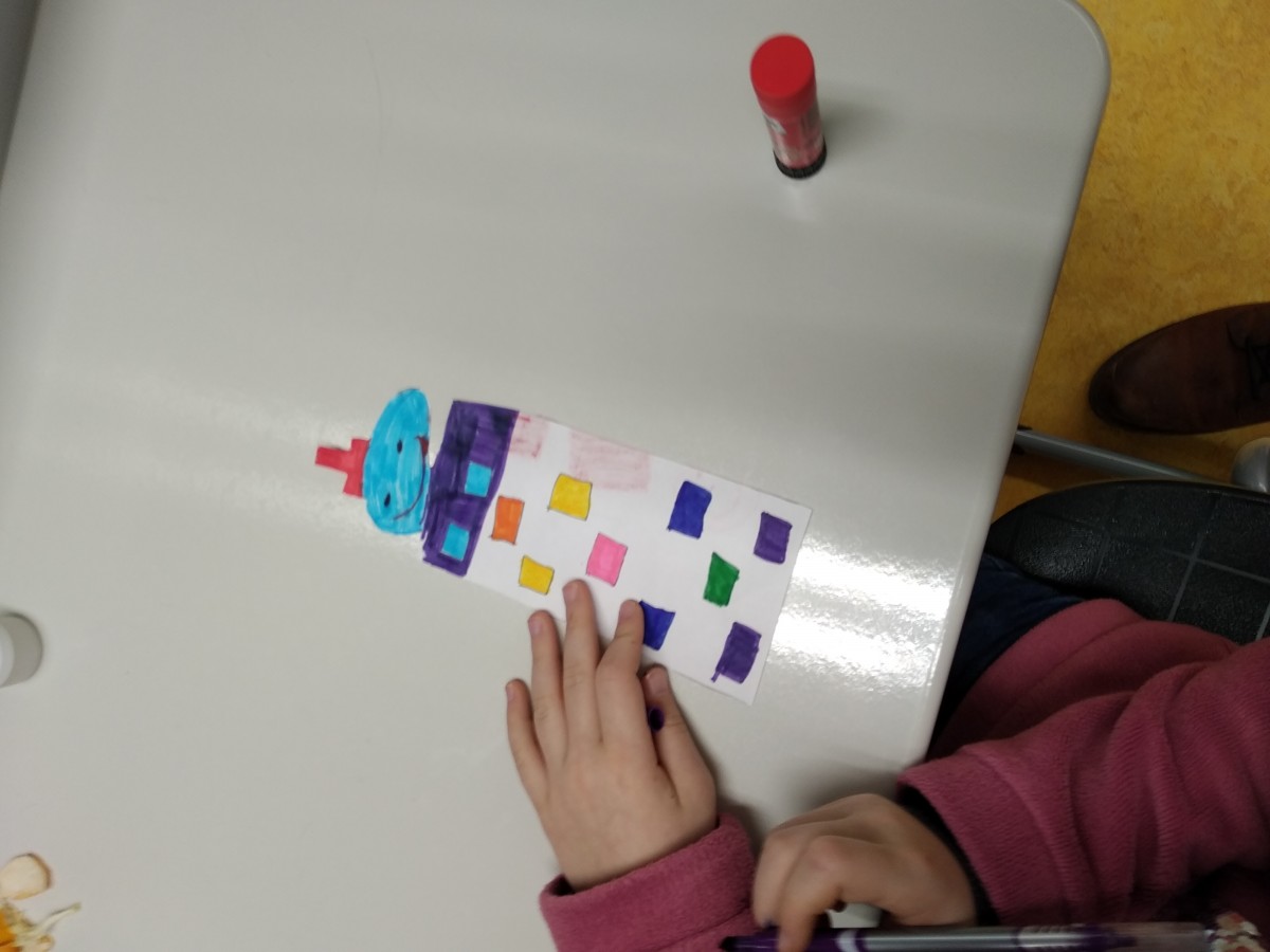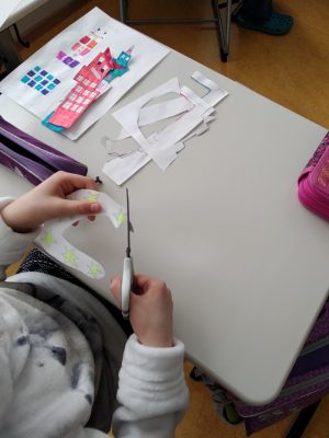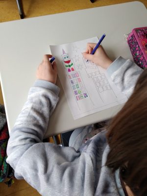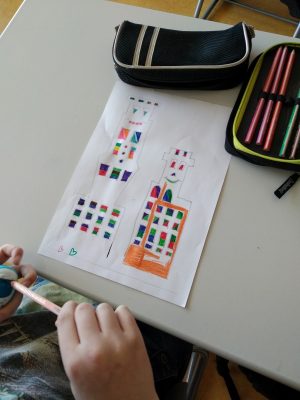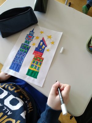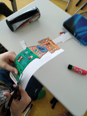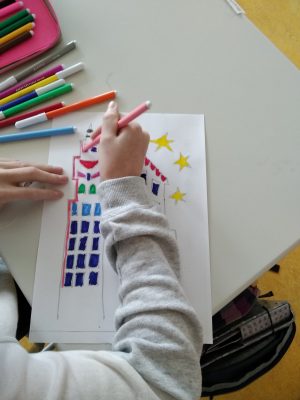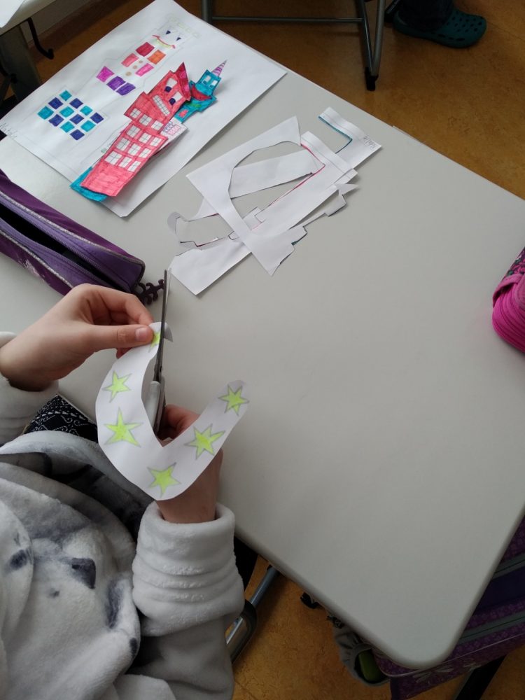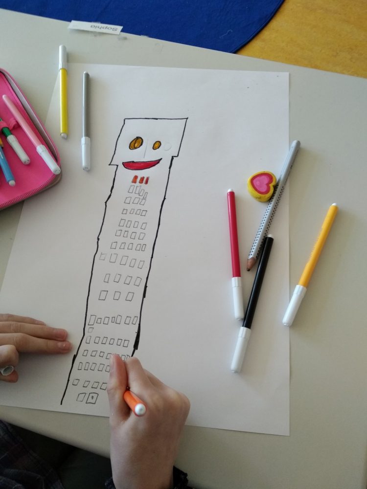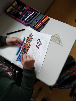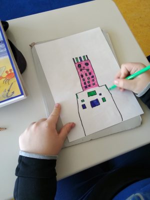 Einige Wochen haben wir in der Klasse 4/5 an einem Gemeinschaftsbild frei nach James Rizzi gearbeitet. Dabei haben wir zunächst alle Vorlagen nach unseren Farbvorstellungen ausgemalt. Anschließend durften wir unsere eigenen Häuser entwerfen und farblich gestalten. Die Häuser haben wir nach und nach aufgeklebt. Zum Schluß haben wir unser Gemeinschaftsbild noch mit selbst entworfenen Fahrzeugen, Flugzeugen, Ufos, Sternen und Wolken verziert.
