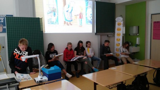 Weiter ging es mit dem obligatorischen Lesewettbewerb der Klassen. In einer Vorauswahl wurden in jeder Klasse die besten zwei Leser ausgewählt, die dann bei Frau Hofmann und Frau Gnahn einen geübten und einen unbekannten Text vortragen durften.