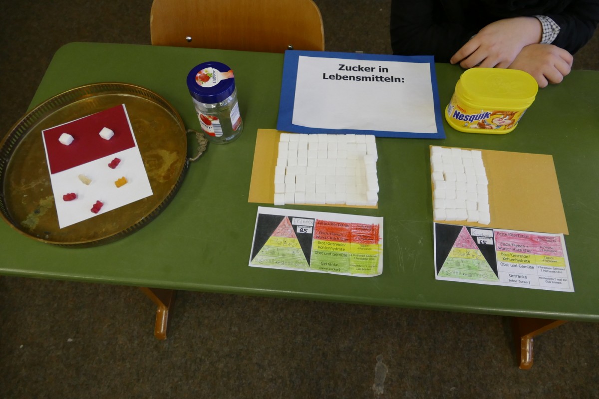 Die Klasse GL 3/4 hat mit ihrer Klassenlehrerin Frau Hofmann eine Präsentation zum Thema Gesundes Frühstück vorbereitet. Interessierte Klassen konnten sich über Zucker- und Fettgehalt verschiedener Getränke und Lebensmitteln informieren. Jeder Schüler der Klasse übernahm einen Teil der Präsentation und so entstand eine kurzweilige Informationsveranstaltung für die anderen teilnehmenden Klassen.