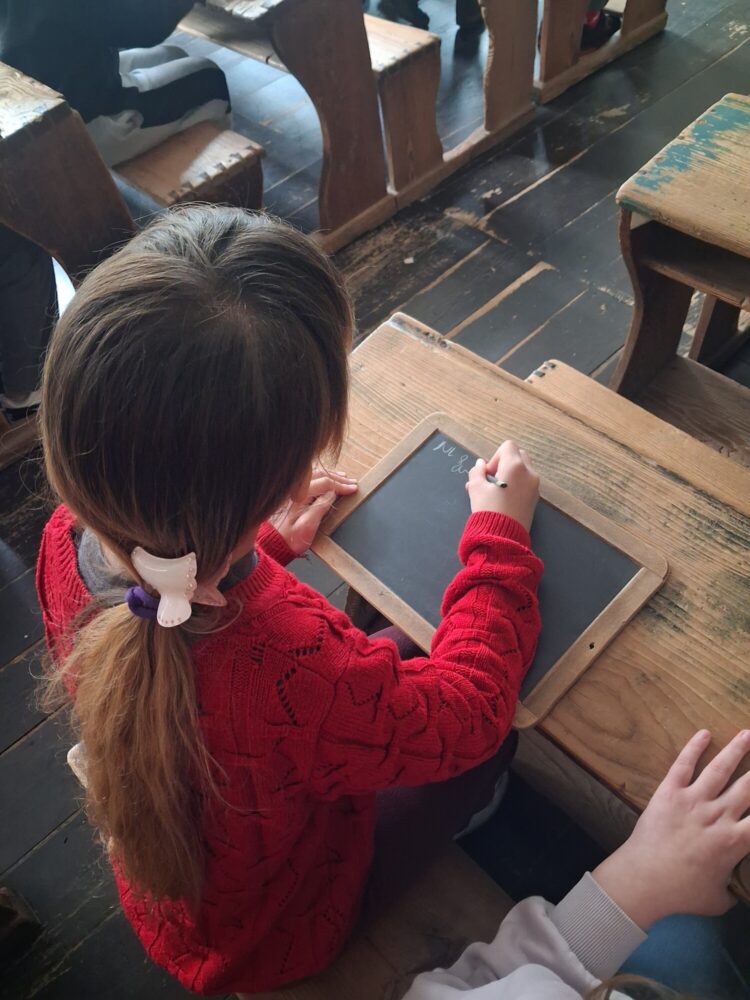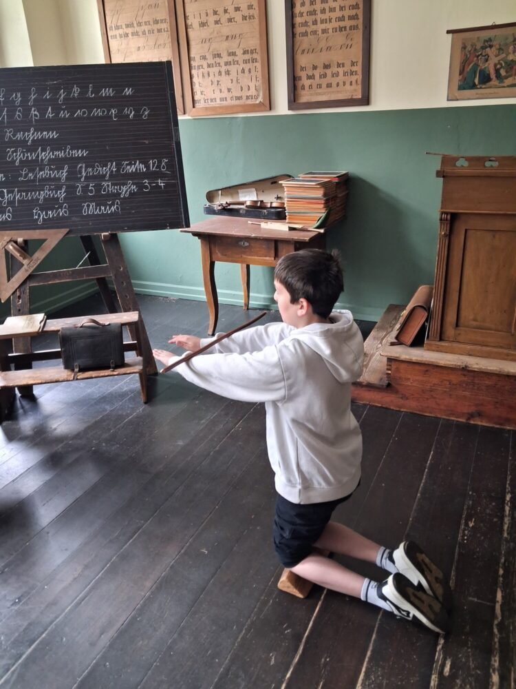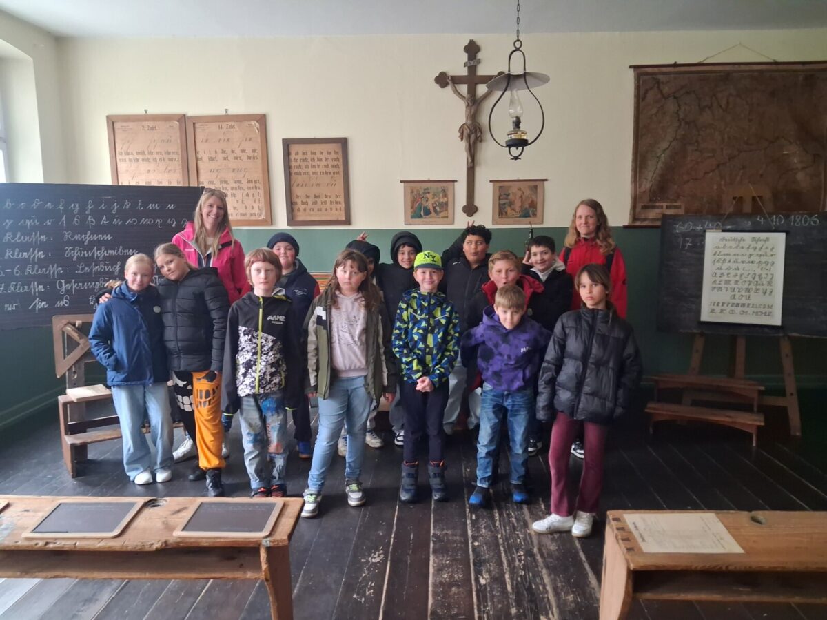 Die Klasse 3/4 G unternahm kürzlich einen spannenden Ausflug ins Schulmuseum. Dort konnten die Schülerinnen und Schüler am eigenen Leib erfahren, wie Schule früher einmal war. Mit großem Interesse probierten die Kinder das Schreiben mit Griffeln auf Schiefertafeln aus und wagten sich sogar an die ungewohnte Sütterlinschrift. Besonders spannend war es zudem, alte disziplinarische Maßnahmen kennenzulernen: So konnten die Kinder ausprobieren, wie sich Strafen, wie z.B. das Tragen der „Eselskappe“, das Stehen in der Ecke oder das „Holzscheitelknien“ anfühlten. Der Besuch machte Geschichte lebendig und sorgte für viele staunende Gesichter. Am Ende waren sich alle einig: Dieser Ausflug war eine spannende Erfahrung!