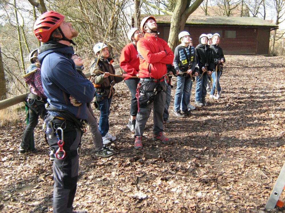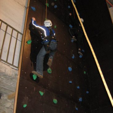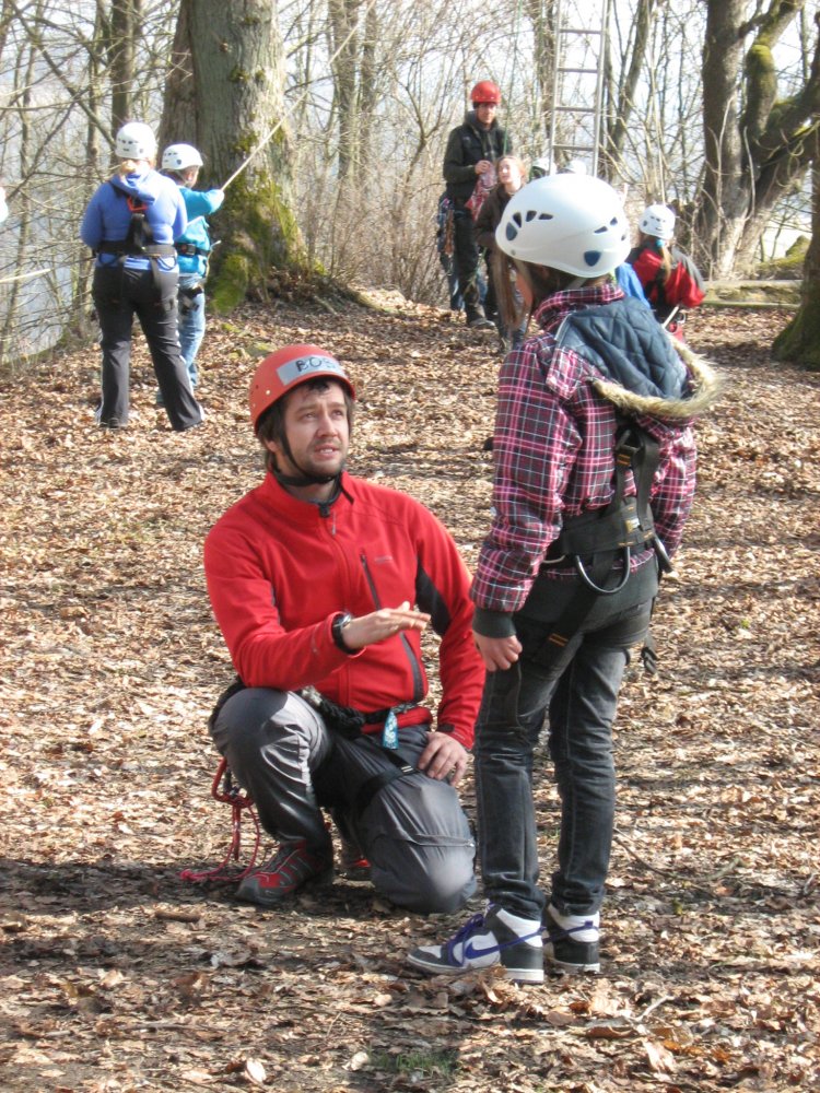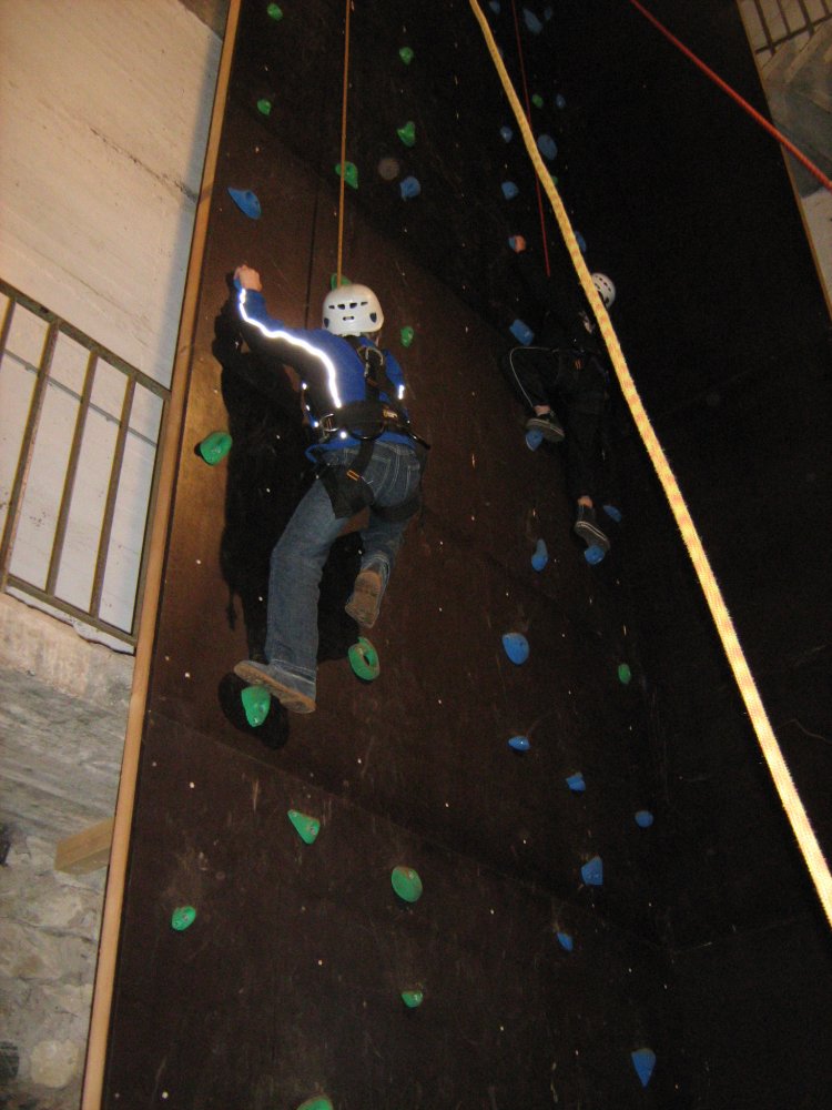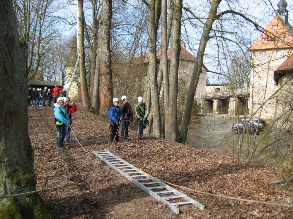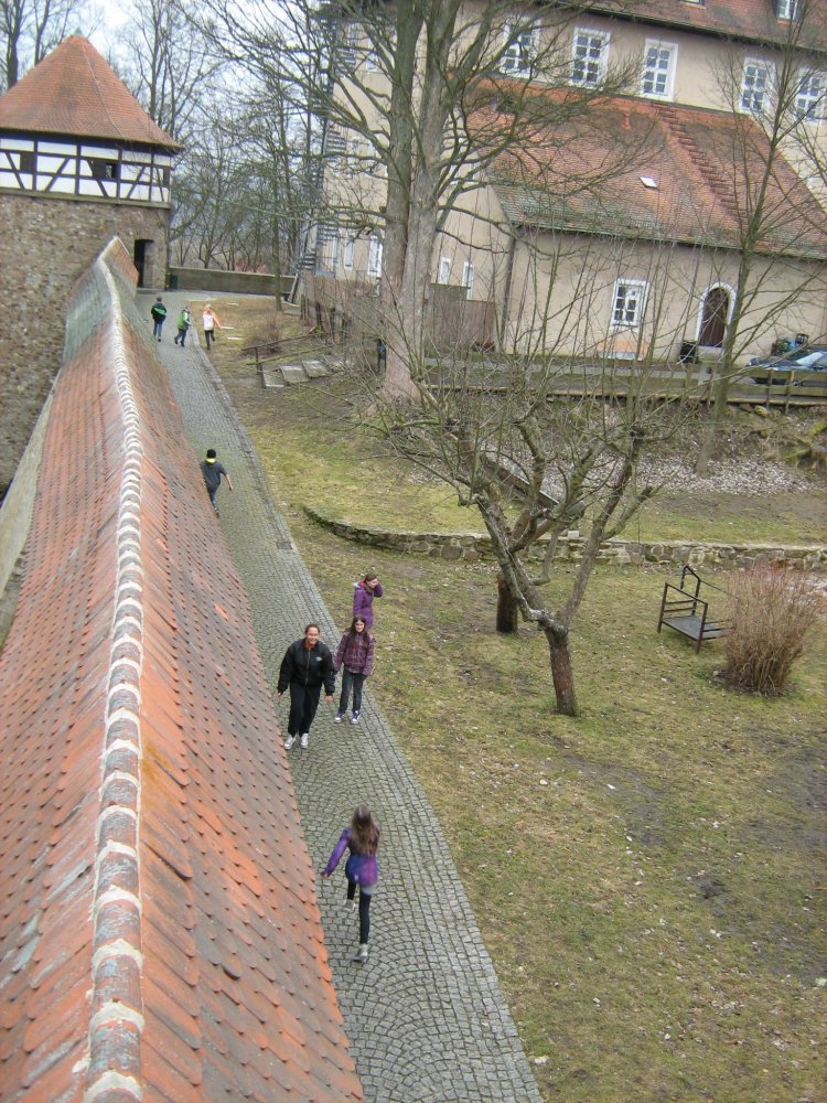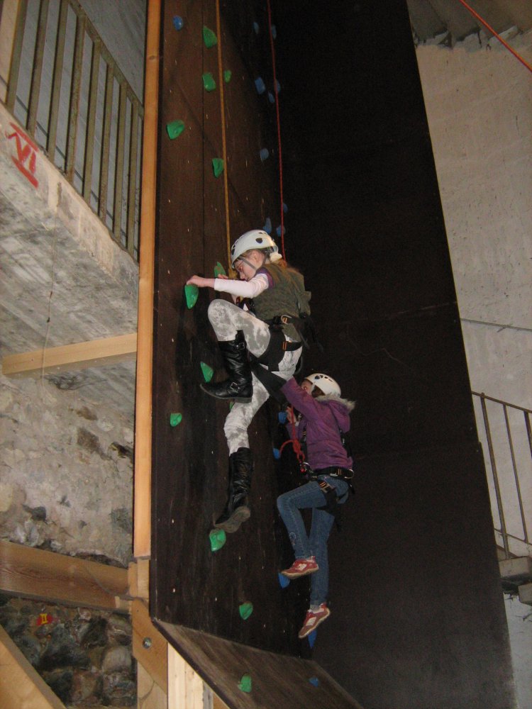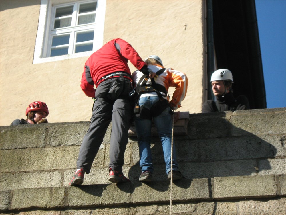 Danach haben wir uns in 2 Gruppen aufgeteilt. Eine Gruppe ist zum Klettern an die Kletterwand und die andere Gruppe hat sich von der 12 Meter hohen Burgmauer abgeseilt. Als wir damit fertig waren, haben wir getauscht.