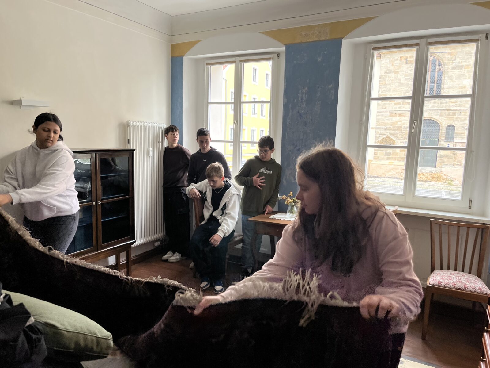 Zuerst durften die Schüler die Ausstellungsräume des Wohnhauses von Herrn Lommer besichtigen, wo Ihnen originale Gegenstände aus diesem ursprünglich mittelalterlichen Gebäude gezeigt wurden. Besonderen Anklang fanden eine mumifizierte Maus und eine vergilbte Spielkarte.
