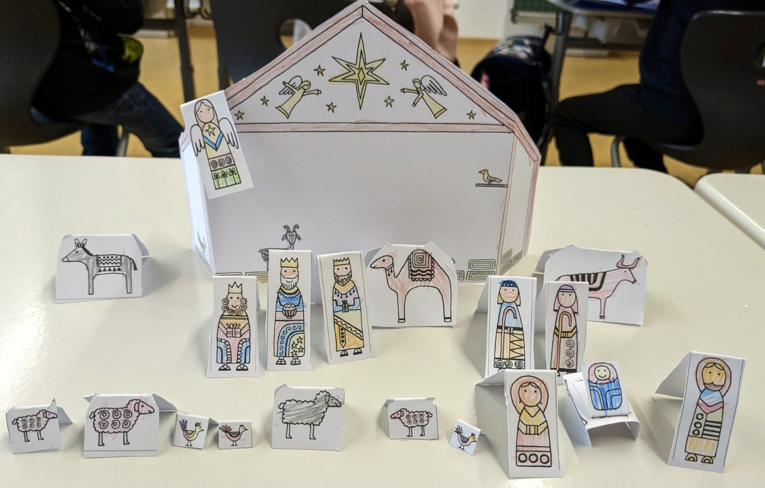 In der 1A / 2 haben wir heute Krippen gebastelt. Wir haben die Vorlagen ausgemalt, ausgeschnitten und gefaltet. Dann haben wir die Krippen auf den Tischen aufgebaut und Herr Lunz hat sie dann fotografiert.